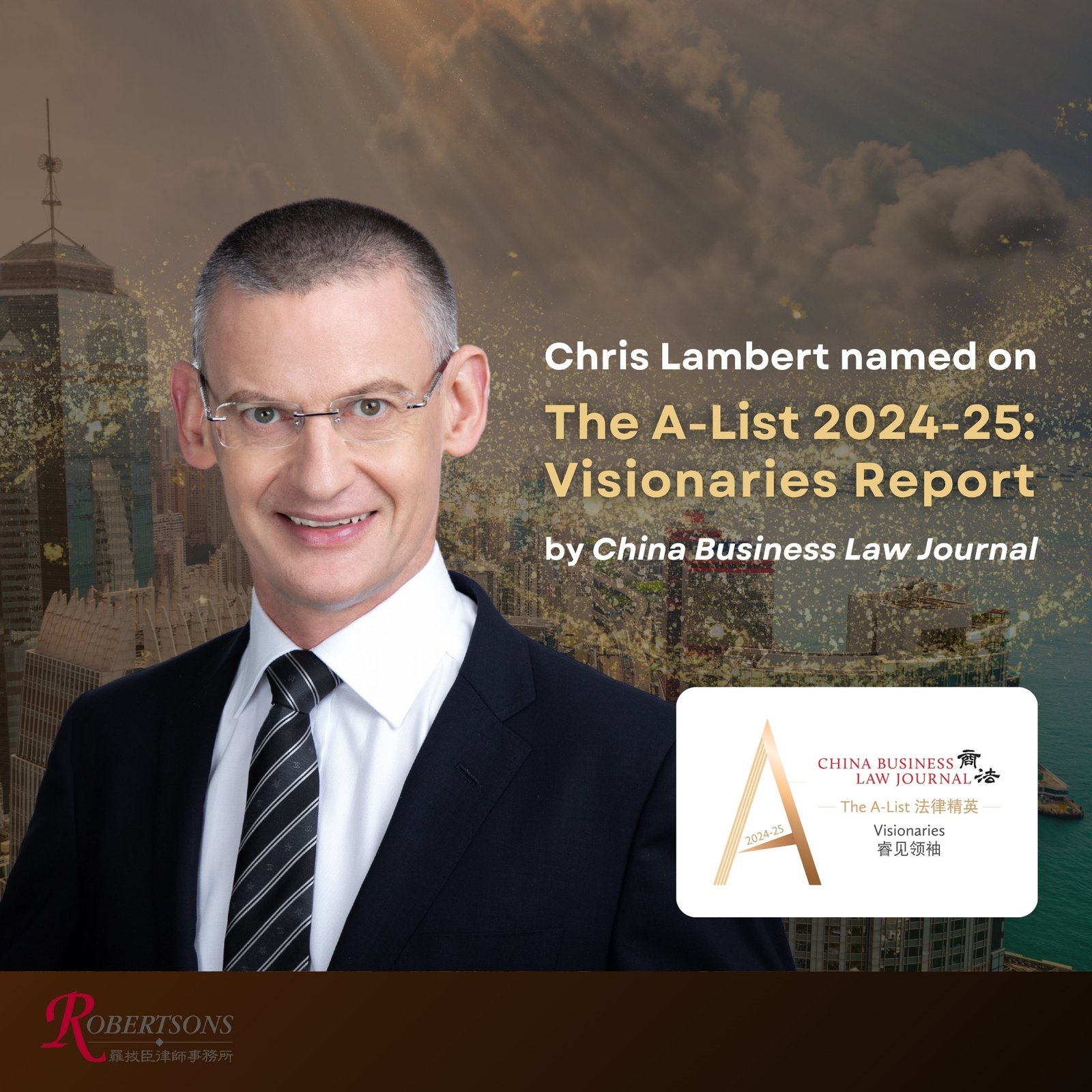 Robertsons is delighted to announce that Robertsons’ Managing Partner, Chris Lambert, has been named on China Business Law Journal‘s A-List 2024-25: Visionaries report, as one of the foreign firm lawyers most highly recommended by China’s legal market.