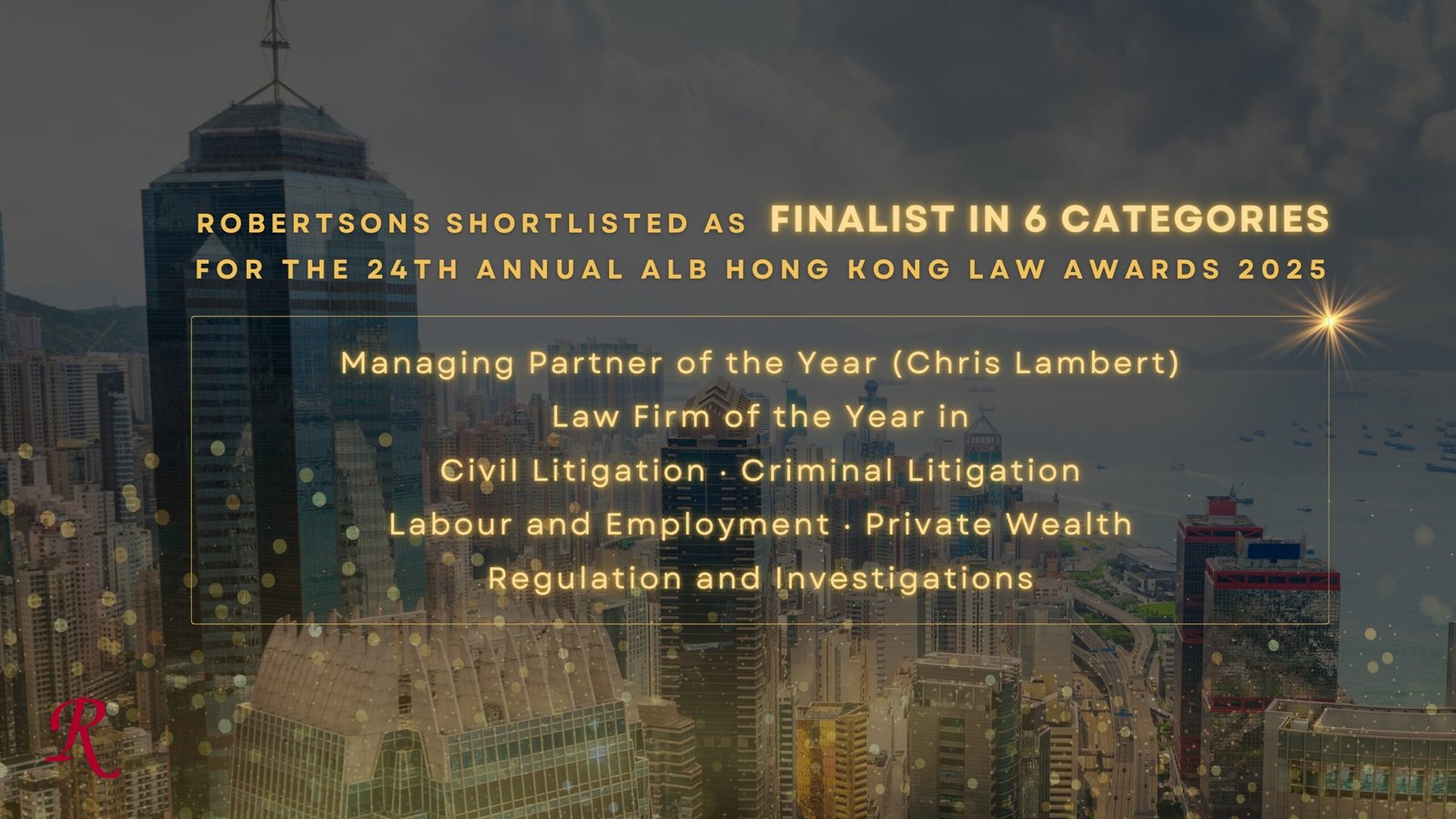 Robertsons shortlisted as finalist in 6 categories for ALB Hong Kong Law Awards 2025